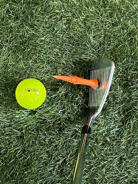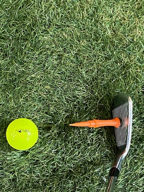 フェース面にロングティーをセットして、リーディングエッジを「飛球性=HONMAのロゴ」に直角に合わせると